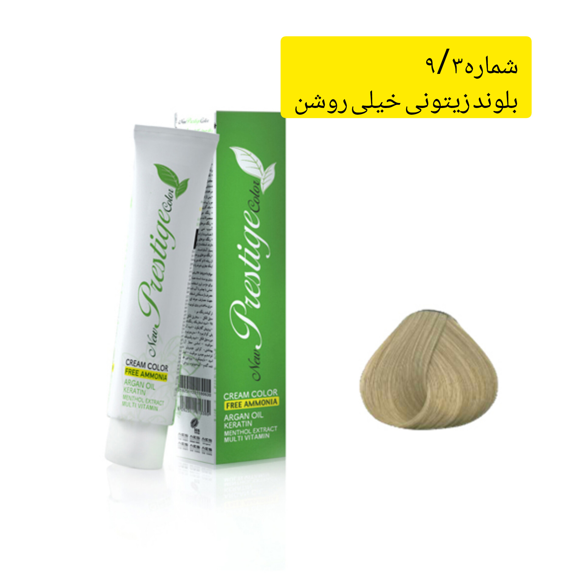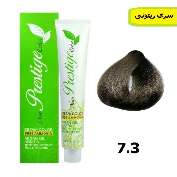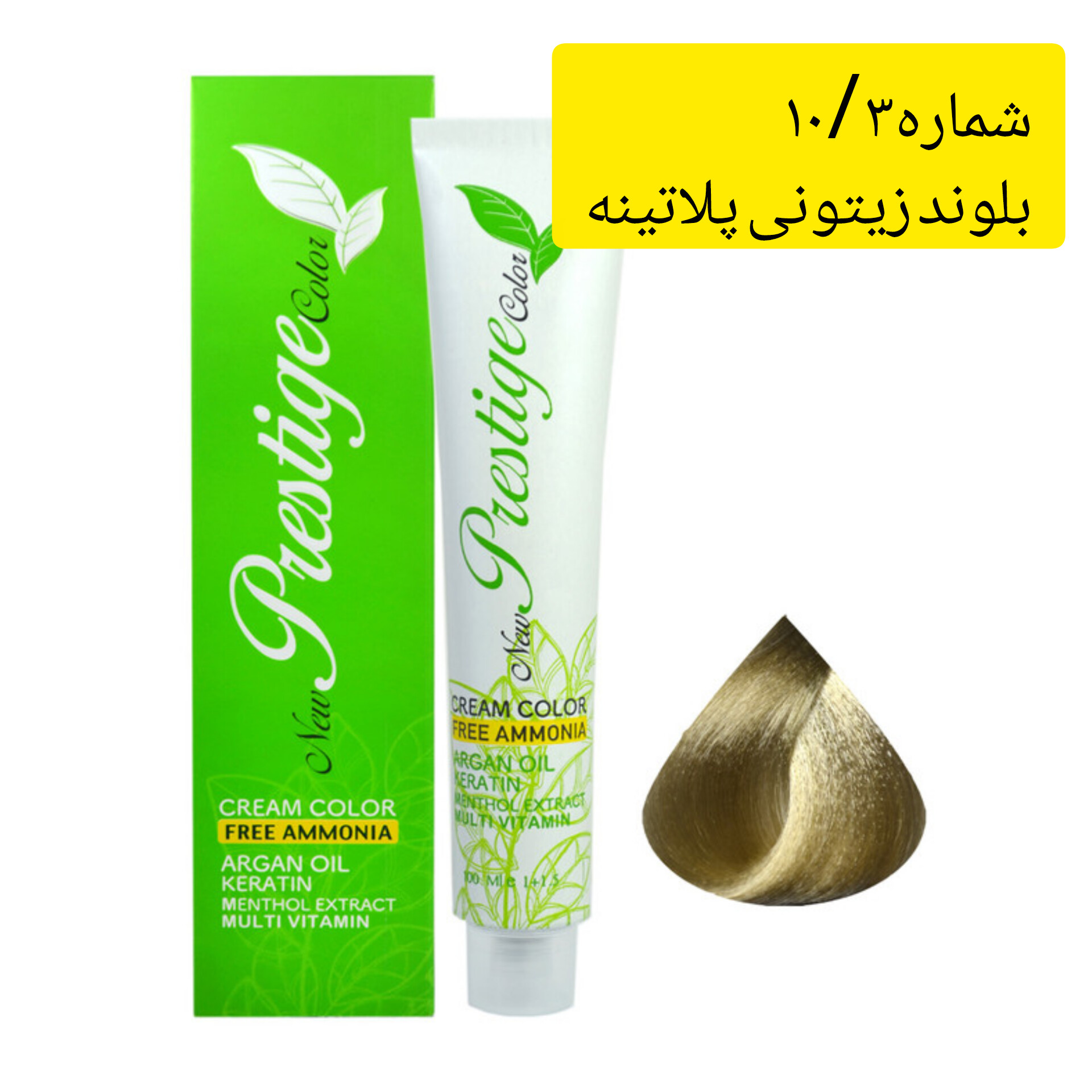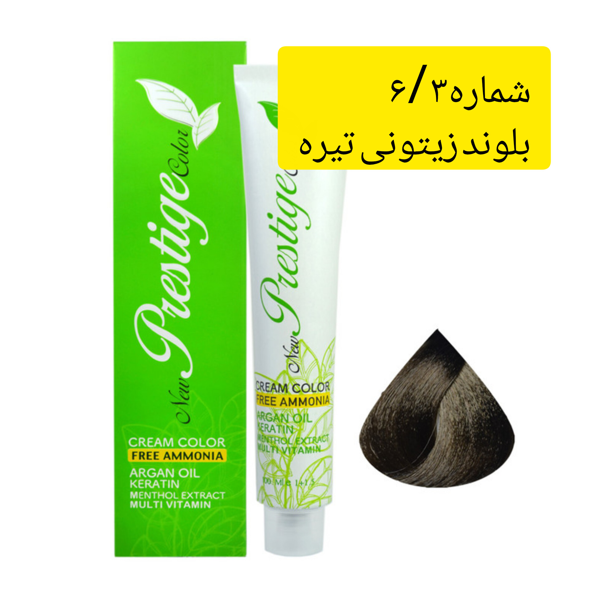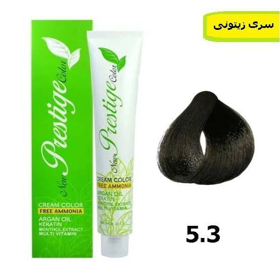 رنگ مو پرستیژ گیاهی بدون امونیاک حجم ۱۲۰ میل مناسب مو کراتینه و اسیب دیده از شماره۵/۳تا۱۰/۳سری زیتونی حاوی روغن کراتین